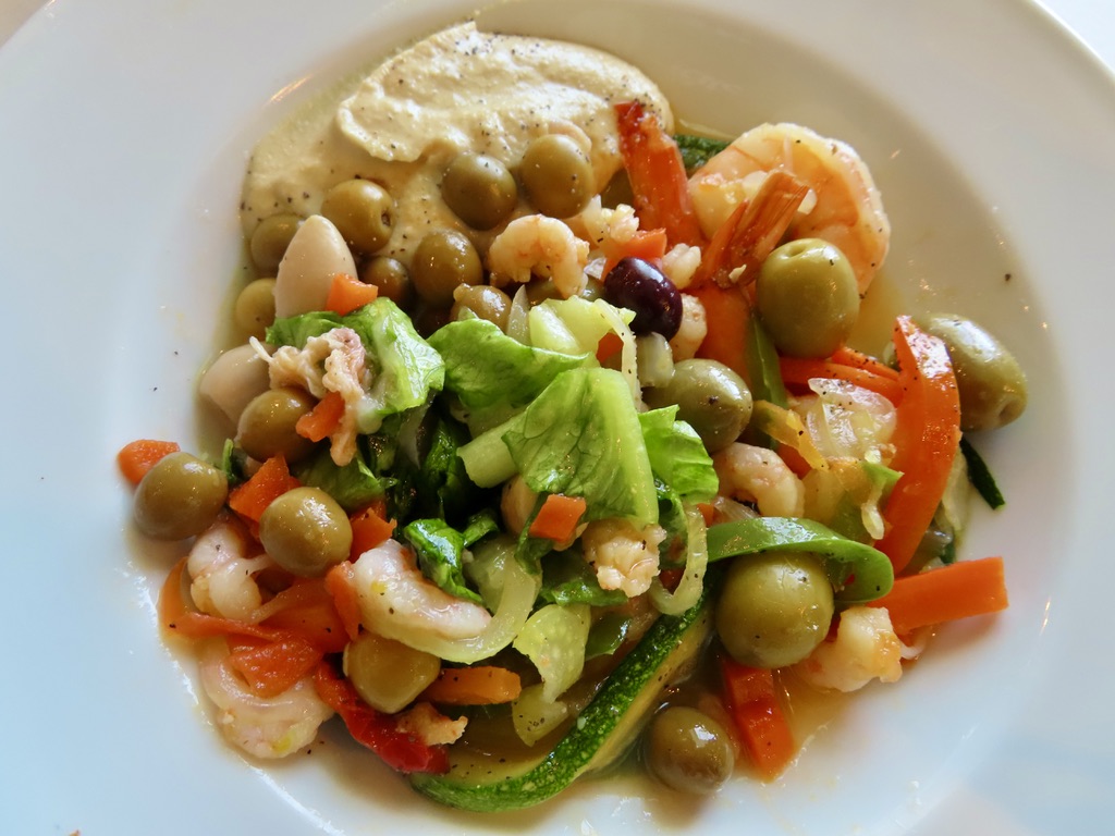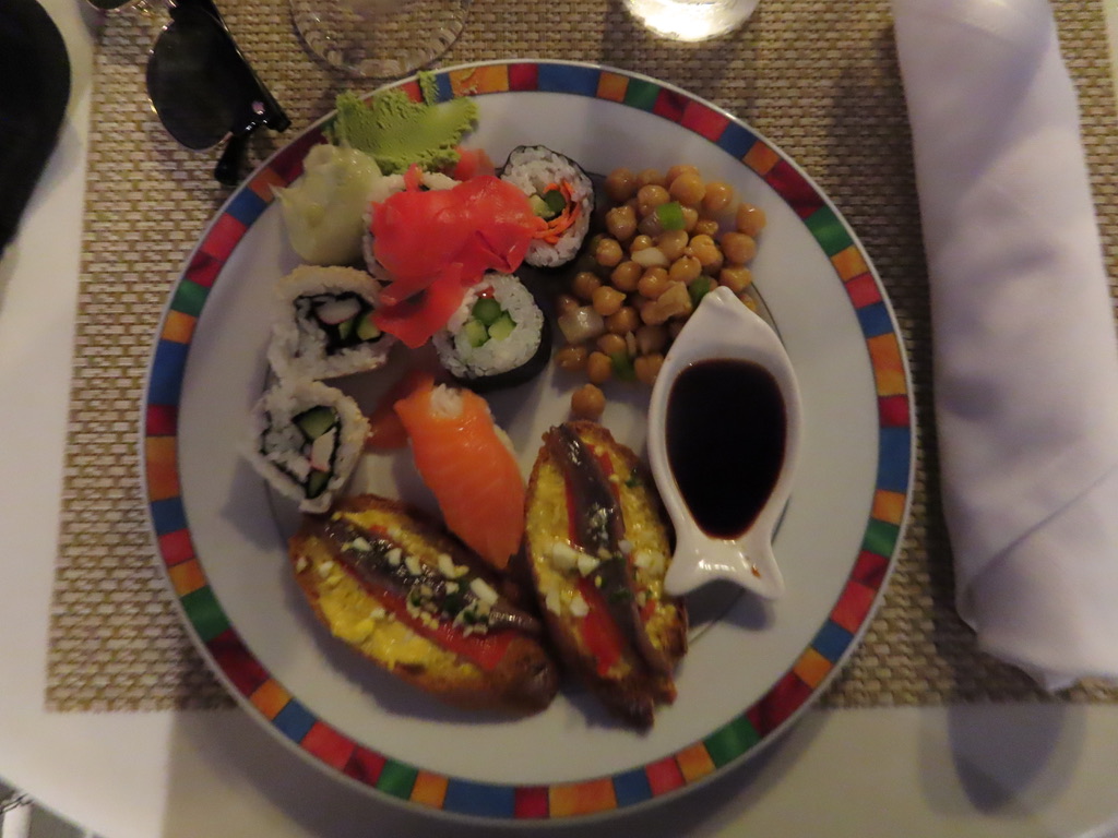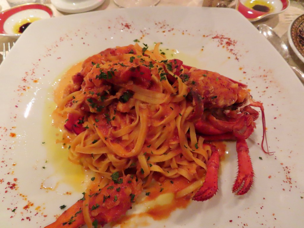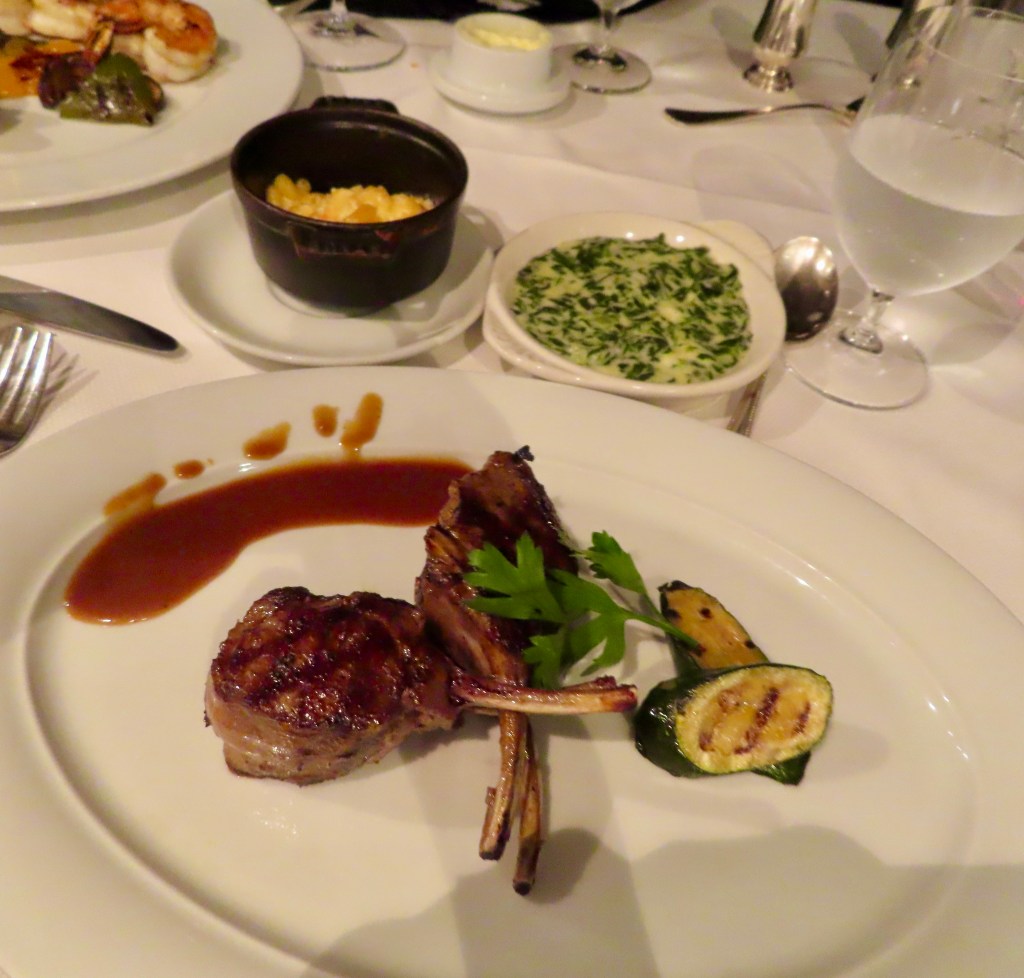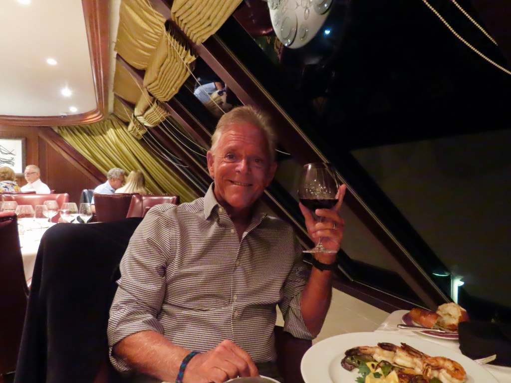 Dining alfresco on the ship, JD started off with some beautiful sushi, a tropical bean salad, and Sicilian anchovy crostini ( anchovies not one of my favorites, although the plate looked pretty). I had my fav sushi with carved leg of lamb, while JD continued to deplete the Maine lobster inventory. 🙂