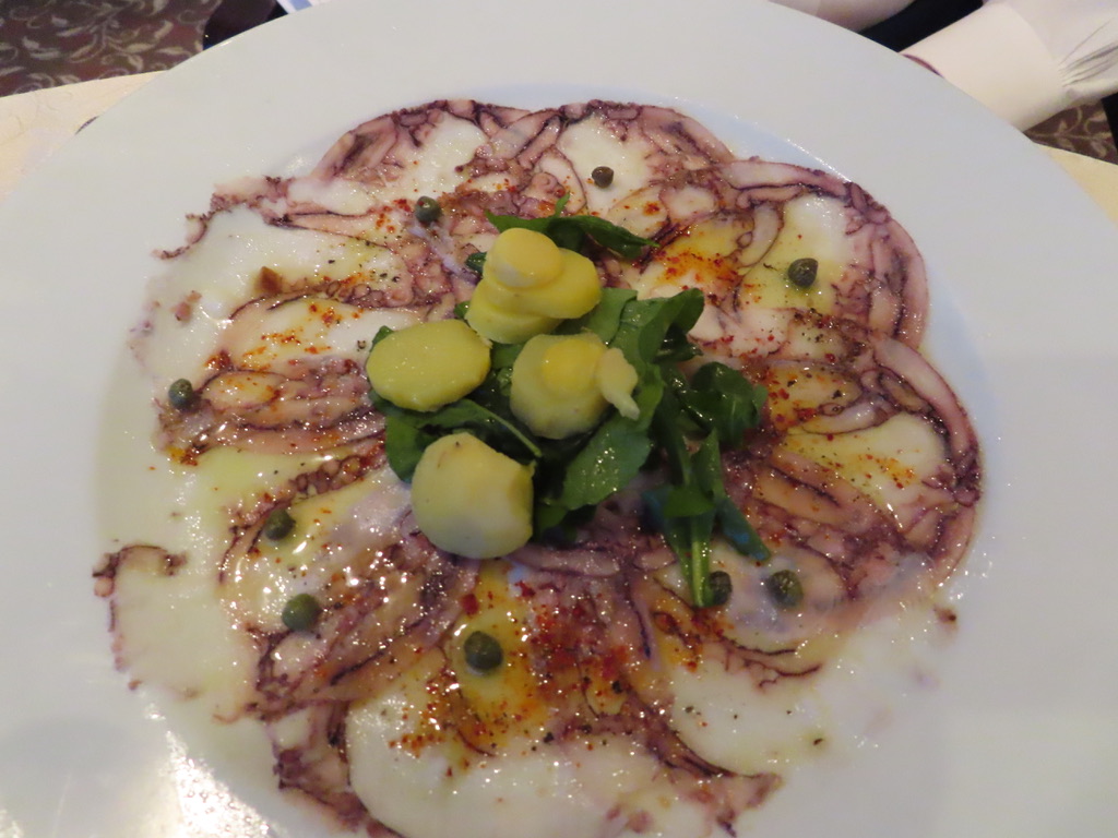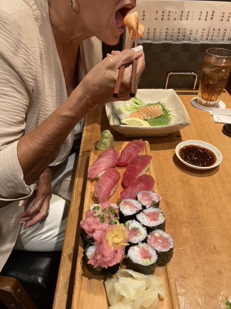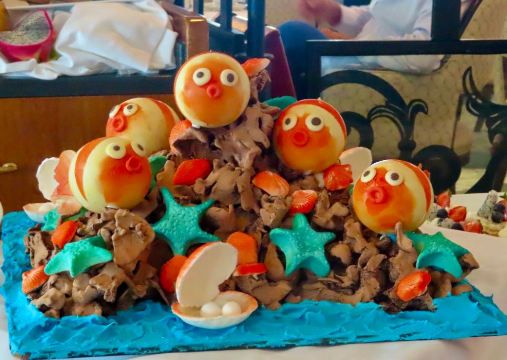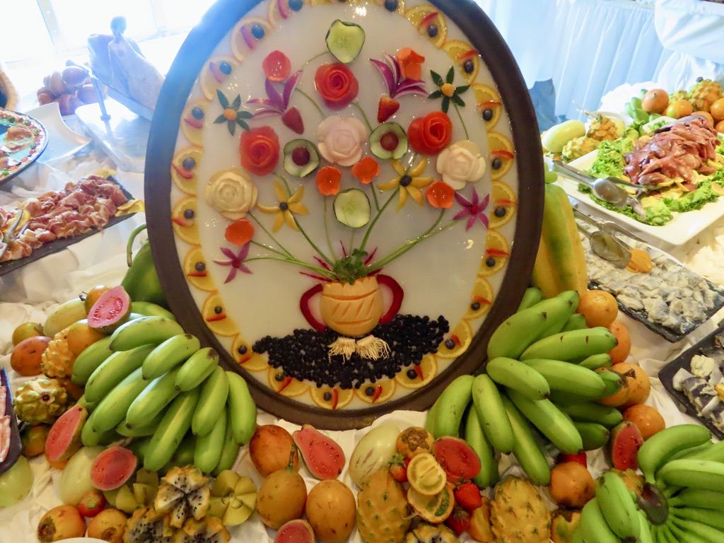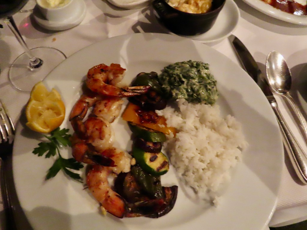 Dining alfresco on the ship, JD started off with some beautiful sushi, a tropical bean salad, and Sicilian anchovy crostini ( anchovies not one of my favorites, although the plate looked pretty). I had my fav sushi with carved leg of lamb, while JD continued to deplete the Maine lobster inventory. 🙂