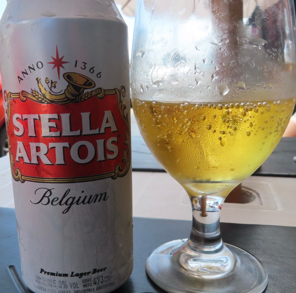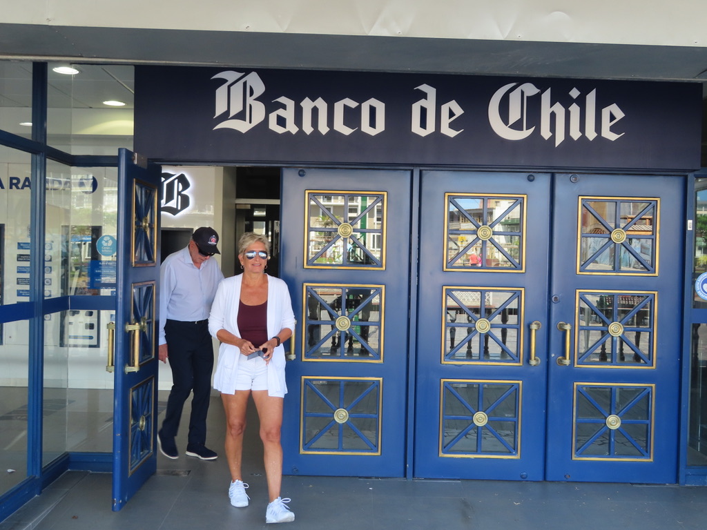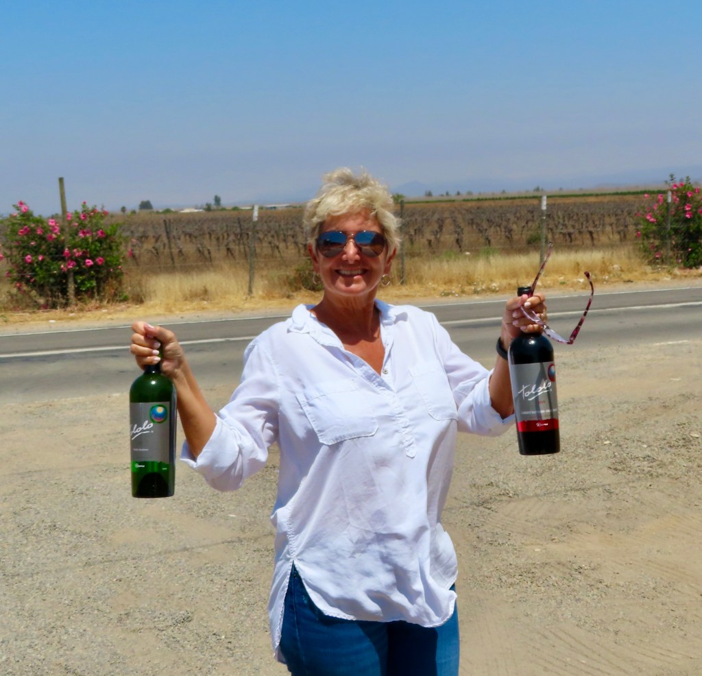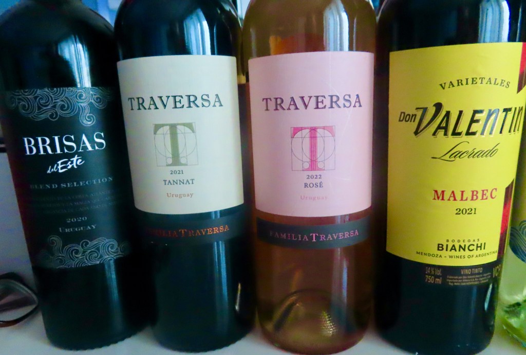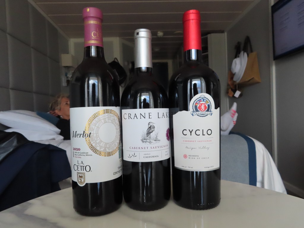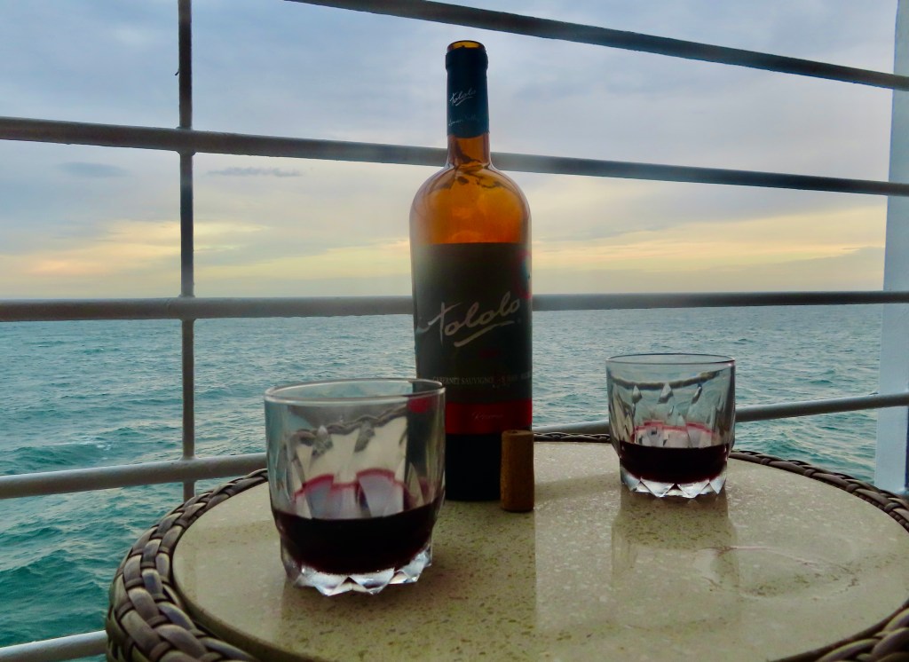 Mission accomplished at the local mercado. Uno Argentinian and Uno Chilean for our stateroom stash for veinte do’lares!