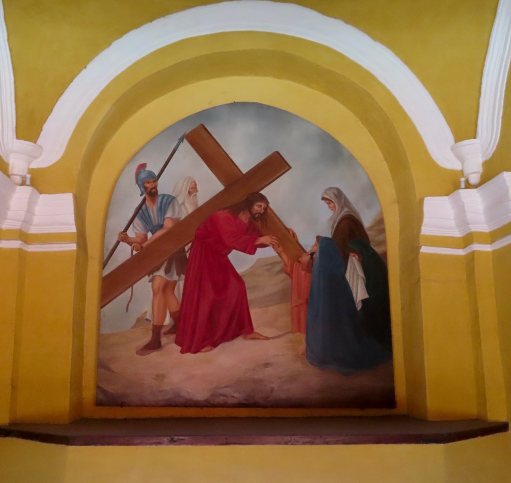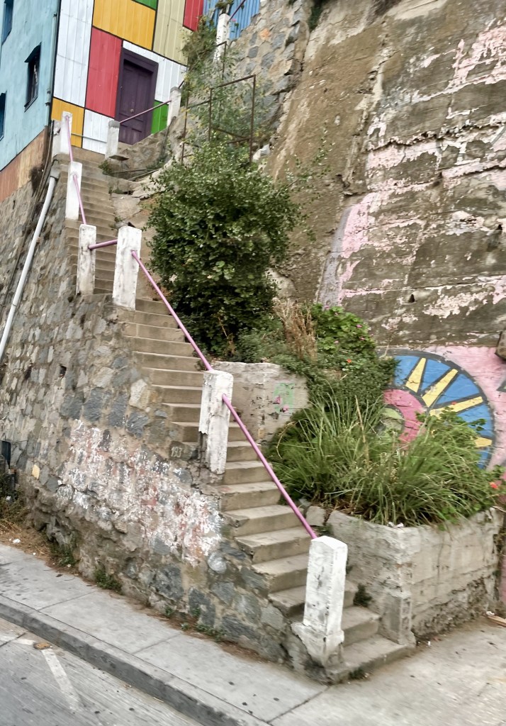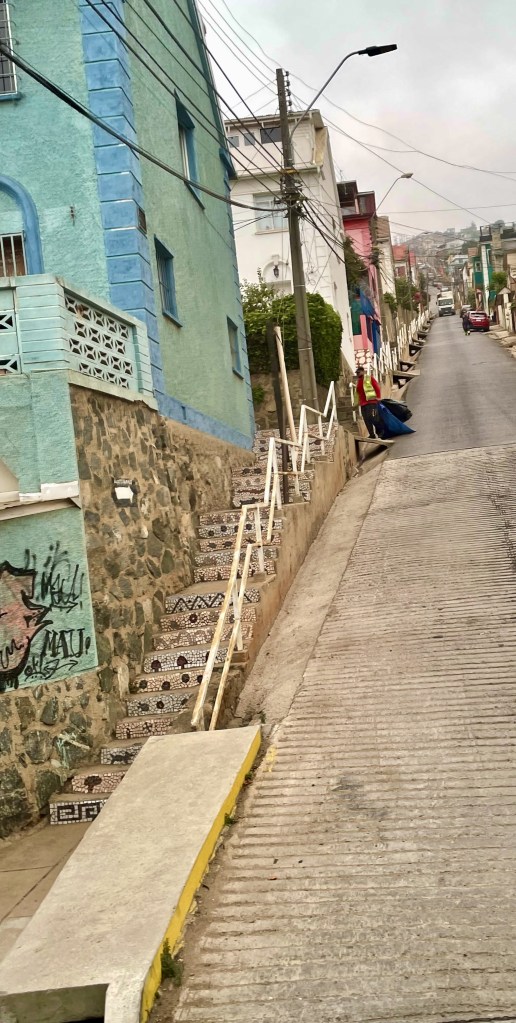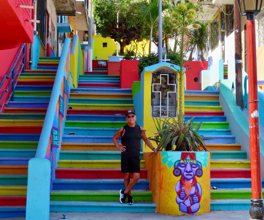 As JD was dragging me thru the streets looking for vino tinto and vino blanco at bargain prices ,we came across this colorful stairway entrance to the local iglesia . Made for another great picture.