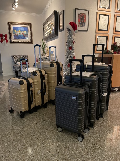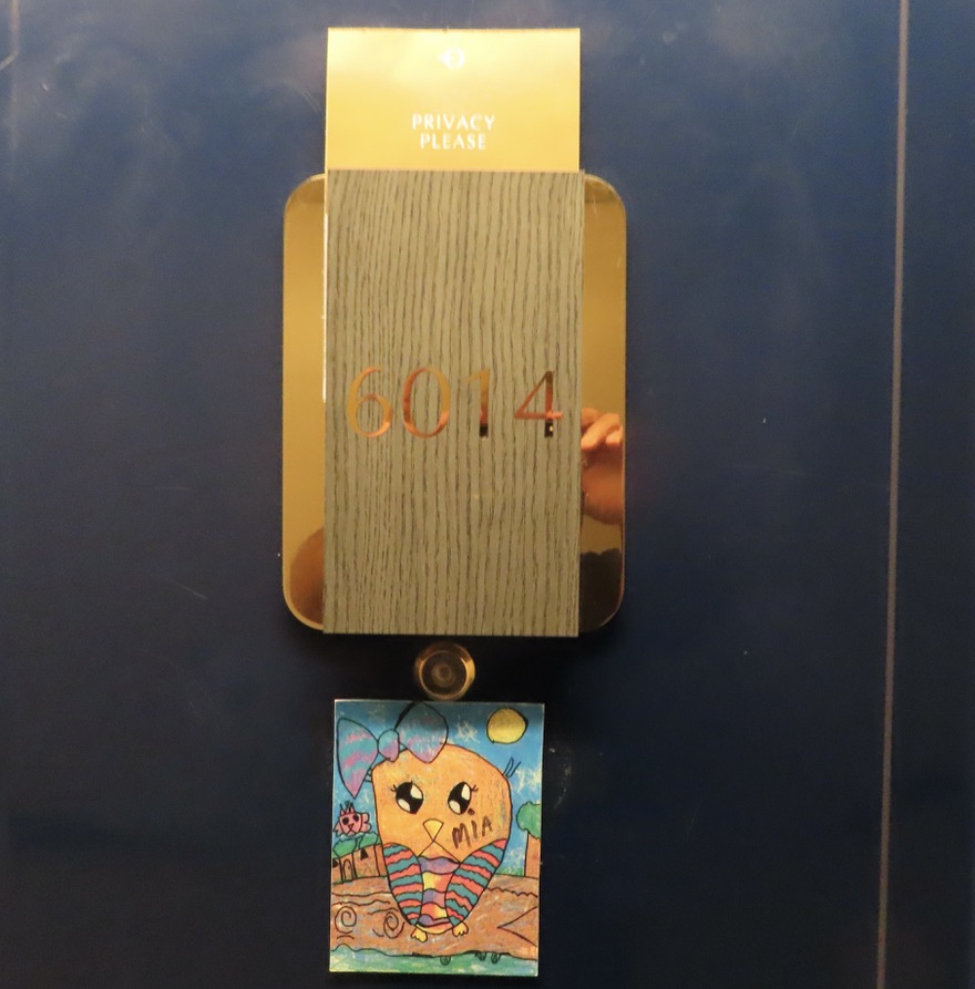 Our room is becoming our home away from home with our personal touches including our front door. Our little niece, Mia-Bentley from Kansas, wanted to stow away in one of our bags. LOL.