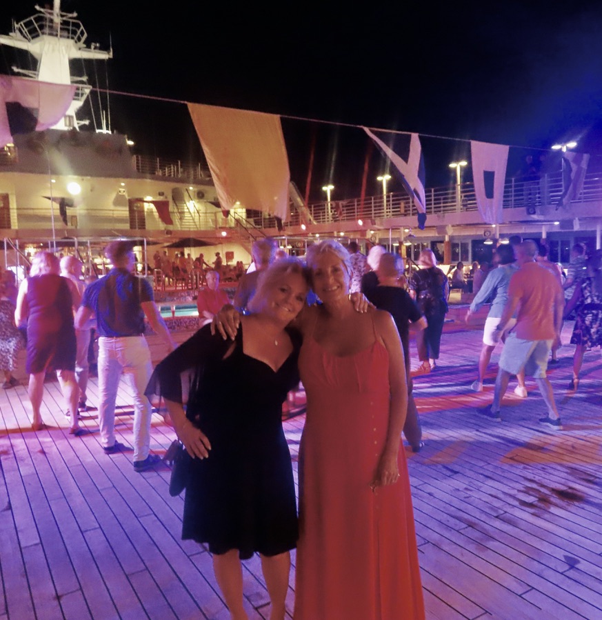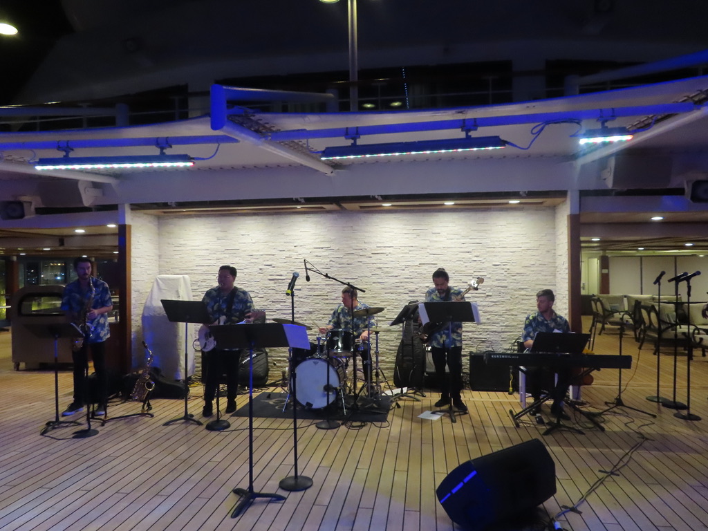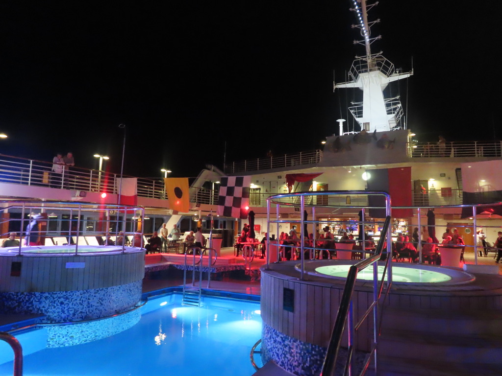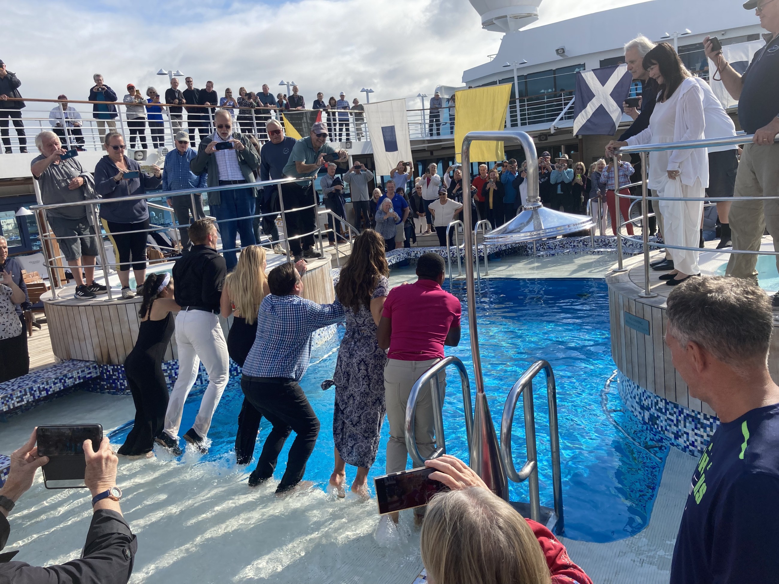 The band was playing, passengers were dancing and the entertainment crew ended the party, by plunging into the chilly pool together.