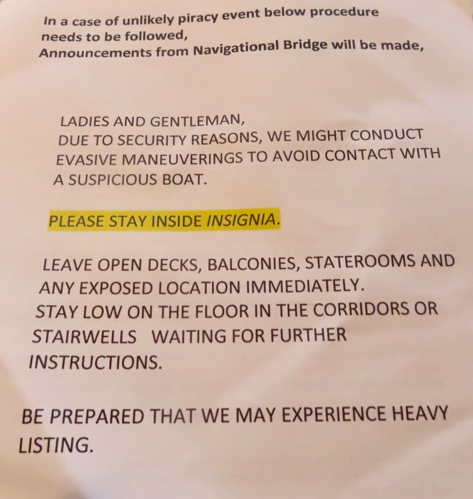 We have 580 cruise neighbors on Insignia. 389 of them are sailing around the world with us. The others are on 21 to 50 day segment cruises.