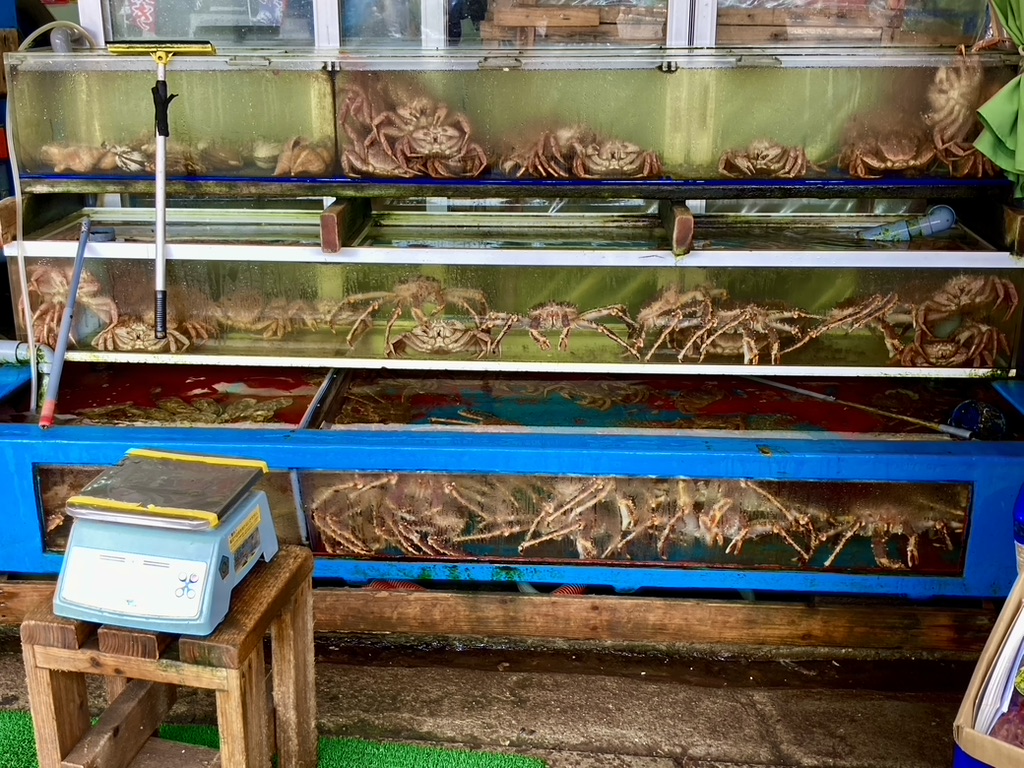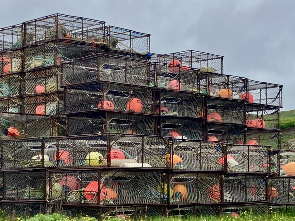 As we were walking in the cold, misty rain on the way to and from the museum, noticed king crab pots lined up along the road.