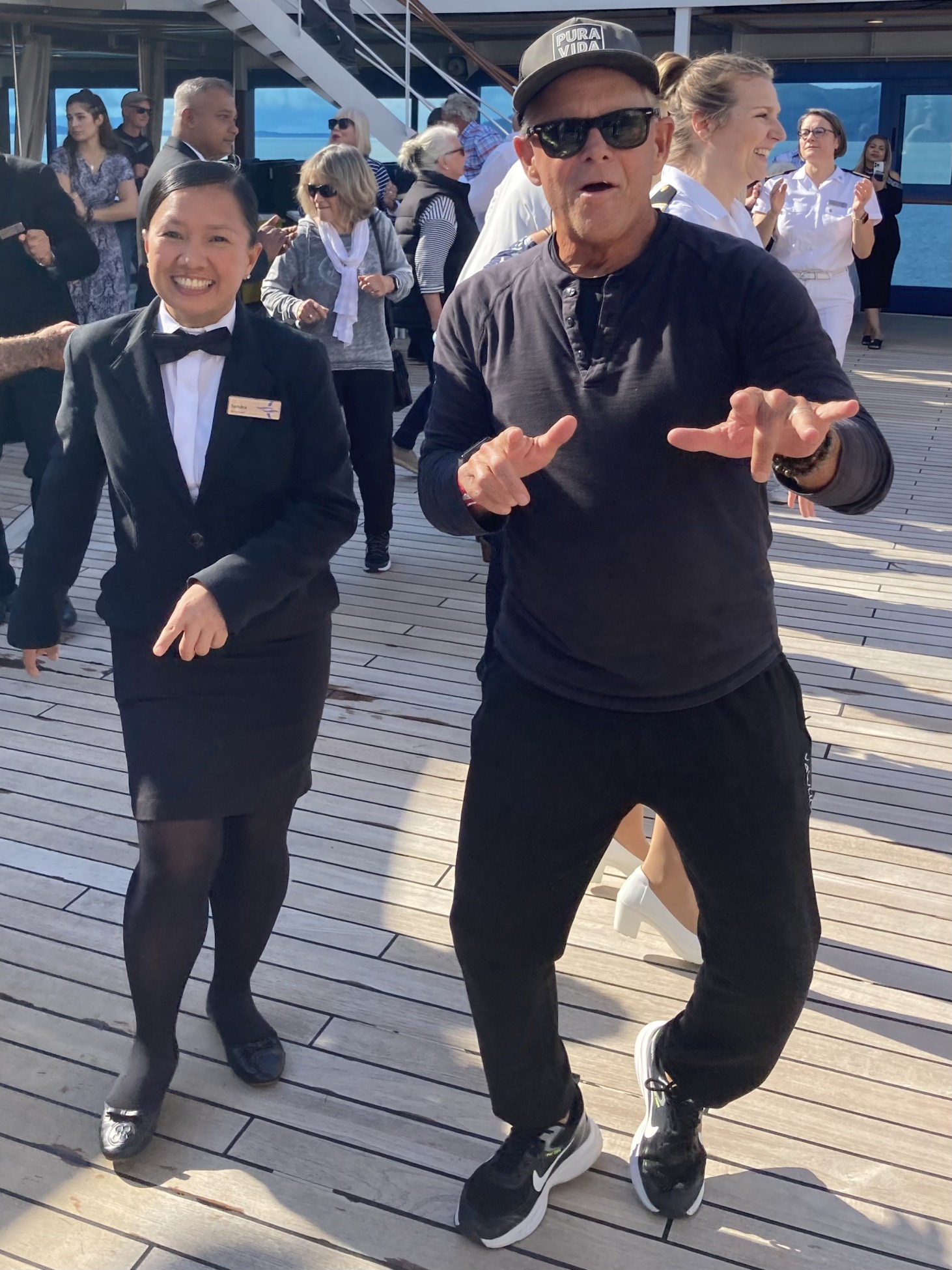 We had our sail- a-way party on the pool deck and all 410 employees walked the track to a roaring an appreciative crowd as they we introduced by departments.
